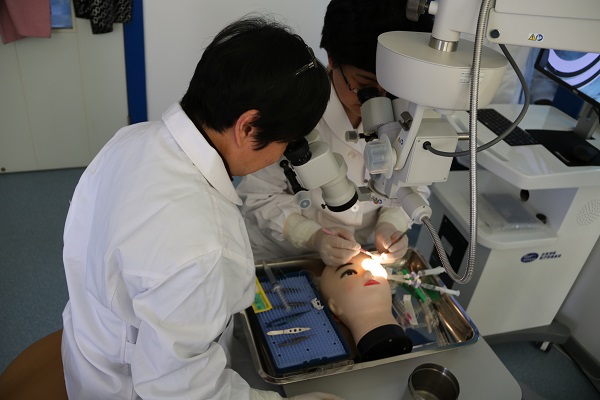 此次培訓作為我國首個角膜移植手術醫師培訓基地的第七次培訓班,凝聚了教授團隊的心血與汗水。在理論學習過程中,采用集中授課、分組討論的方式,由專家指導小組對角膜移植相關理論知識、手術技能進行詳細講解,并向學員展示了相關手術錄像。在臨床實踐技能培訓過程中,采用人工前房聯合豬角膜模擬人眼角膜模型,高清手術顯微鏡下同步示教訓練的方式,本次培訓以常規部分板層角膜移植培訓為主,每人可完成5-8例角膜移植操作。