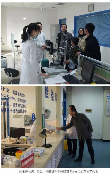 看望完住院患者,韓書記一行又到醫院各處看望了在崗的醫生、護士、醫技等職工。韓書記給廣大職工拜年,韓書記表示:為了廣大人民的眼健康,各位堅守在臨床一線,希望大家要細致、耐心服務,為節日期間的住院、門診患者服務好,解除病痛。高華副院長介紹:醫院已經就節日值班做了充分準備,安排了一、二、三線值班體系。一線人員都是高年資博士學歷的主治及以上醫師,二、三線排班可以滿足突發的大量門診的處理。