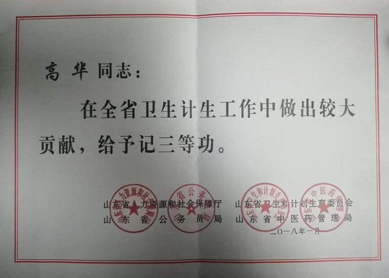 Recently, Human Resources and Social Security Department of Shandong Province, Health and Family Planning Commission of Shandong Province, Administration of Civil Service of Shandong Province and Administration of Traditional Chinese Medicine of Shandong Province have jointly issued a document to commend and give awards to advanced collectives and individuals in the provincial health and family planning system. The vice president of our hospital, Hua GAO, received a Third-class Merit.