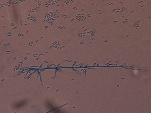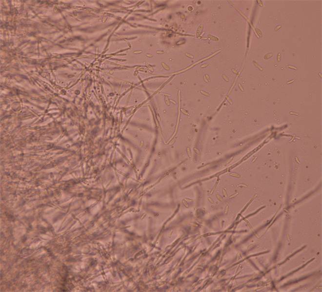 一眼內炎患者,發病時間一月余,一直在外院治療病情加重,轉入我院。眼底病醫生立即手術,同時抽取玻璃體、房水進行真菌、細菌培養,次日發現真菌培養基有微生物生長,直接刮片鏡檢發現為絲狀真菌,并產生孢子。圖片如下:
