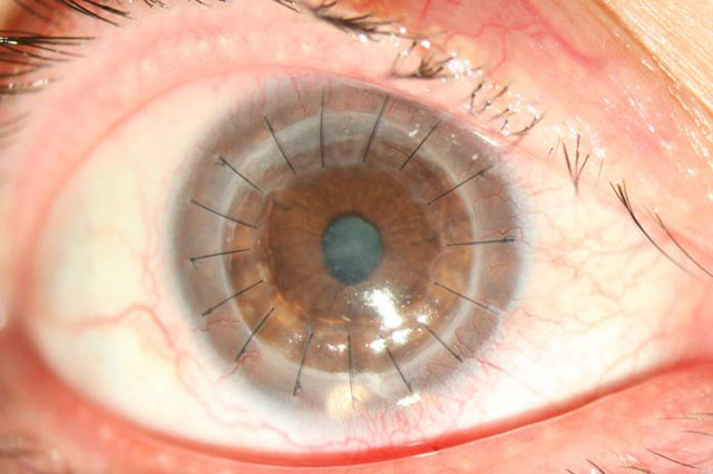 圖1 PKP術后3個月晶體呈乳白色渾濁 視力0.05