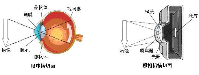 1..眼的屈光:光線進入眼的光學系統,在視網膜黃斑部成像稱為眼的屈光。 2.眼屈光系統組成:角膜、房水、?晶狀體和玻璃體。 眼睛屈光系統成像與照相機成像原理相似:角膜和晶狀體相當于鏡頭,視網膜相當于膠卷,瞳孔相當于光圈。