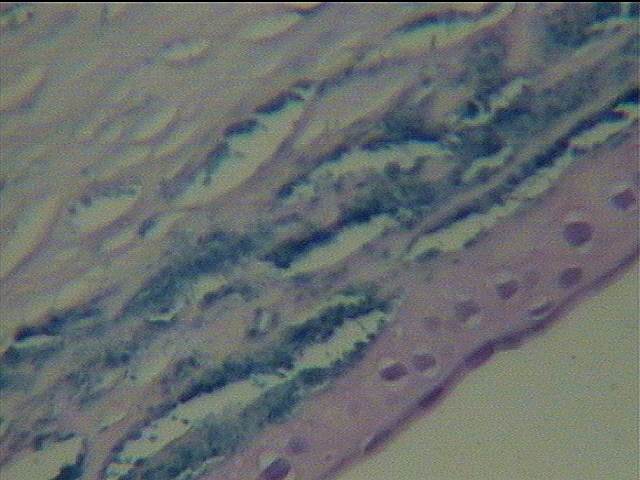 組織病理學變化:角膜上皮厚薄不均。前彈力膜部分破壞、斷裂或分裂成數層。實質板層擺列較疏松。在實質纖維之間有甚多大小不等的柳葉狀或梭形空隙。部分角膜實質細胞胞質豐富而核固縮。后彈力膜普遍增厚呈板層狀,或呈滴狀突伸向前房。內皮細胞數目減少,部分壞死,胞膜破裂,胞核固縮。病變物質分布在上皮下前彈力膜前后的空泡細胞、角膜實質細胞及內皮細胞的胞質內外及實質層空隙內。此種物質在HE染色片中呈嗜堿性淡藍灰色,PAS染色僅淡紫紅色,剛果紅及Masson三色不著色。唯有膠性鐵染色呈非常醒目的鮮藍色。此種染色是病理鑒別斑塊狀營養不良的最重要方法。(圖1-1、1-2)