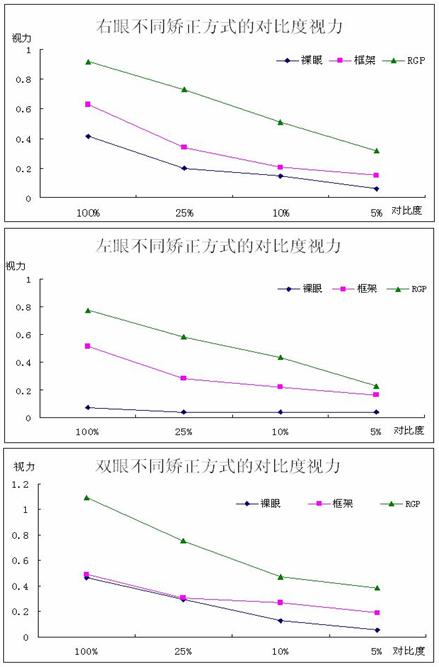 ??? 此例雙眼近視、雙眼不規則散光、雙眼屈光參差患者通過RGP能提供較好的矯正視力;運用對比度視力檢測手段可以有效地評價此患者配戴不同矯正方式的視覺質量,以RGP矯正效果為佳。
