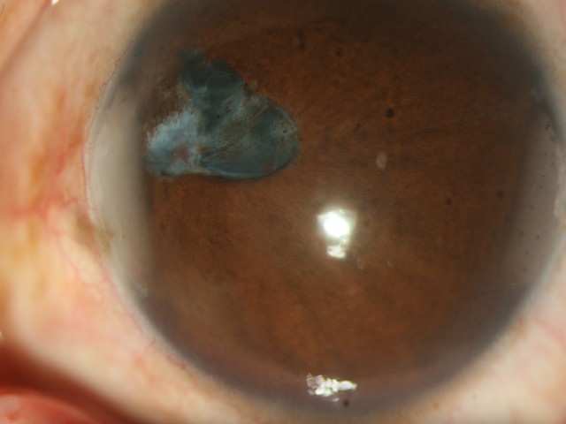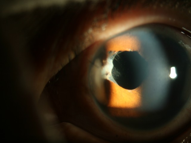 ?? 患者×××,因雙眼視力下降30年,加重2個月。入院查體:右眼視力0.06,左眼視力0.02,雙眼角膜變性,瞳孔不規則,向鼻側移位,鼻側虹膜缺損,全周后粘于晶狀體,晶狀體混濁。??