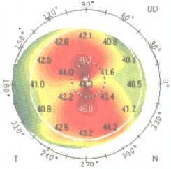 地形圖:右眼 ?41.3@8 / 46.8@98????????????左眼 ?41.1@174 / 46.8@84??(和電腦驗光的散光度數相對應)
