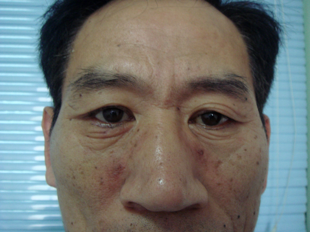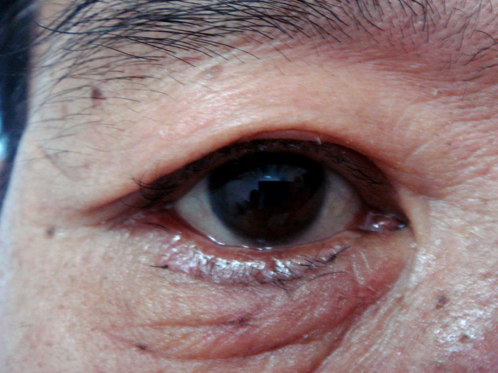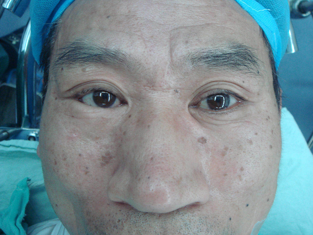 手術后一周拆線前,雙眼下瞼內翻矯正,瞼緣及睫毛位置正常。