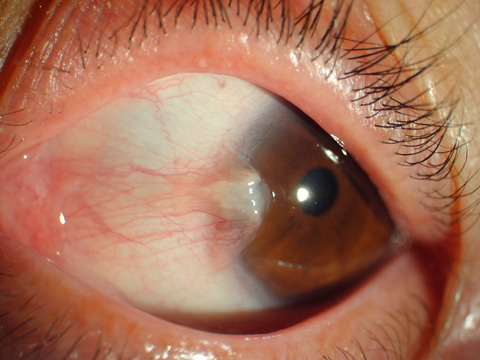 (2)進展型:胬肉的頸部寬大,新生血管多,充血,肥厚,體部呈三角形向兩側伸展,頭部明顯隆起,長入黑眼珠表面,甚至遮擋瞳孔。 ?