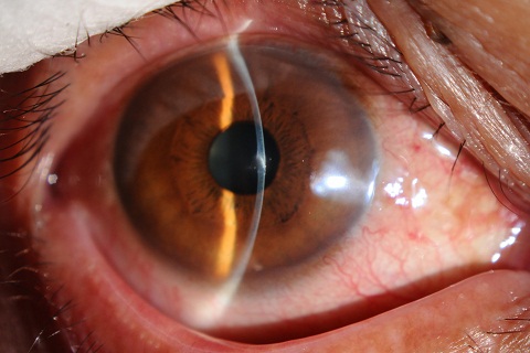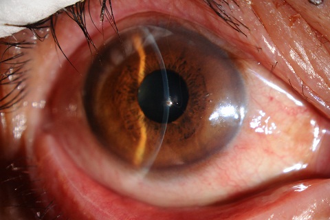 2012年9月25日,山東省眼科醫院角膜病科就接診到這樣一位患者:家住濟南南部山區的一位56歲的王大娘,3天前在摘栗子時不慎被樹上落下的板栗砸傷右眼,隨即感到右眼磨,流淚,疼痛難忍,看東西也變得模糊,大娘起初并沒有太在意,只是去當地診所開了幾種眼藥水回家點眼,以為過兩天就會好,但眼睛一直不見好轉,反而癥狀逐漸加重,視力明顯下降。其在濟南市區工作的女兒聽說母親的病情后,擔心母親病情加重,聽說我院在各種復雜角膜疾病診治方面具有非常高的聲譽,趕緊帶其母來我院檢查,接診醫生詳細詢問了大娘的病史后,在裂隙燈下查看眼部情況,發現右眼角膜中央見一處約0.5*0.5mm2白色圓形浸潤區,中央見紅色細小針狀異物嵌入角膜,幾乎穿透角膜全層,周邊角膜輕度水腫。后為大娘做了視力眼壓等相關檢查,發現右眼視力僅有0.1,門診醫生遂告知大娘因栗子刺扎傷過深,已經引起角膜周圍感染,必須馬上住院治療將異物取出,否則異物存留過久會引起角膜感染進一步加重,甚至導致角膜潰瘍。大娘這才意識到病情的嚴重性,趕緊辦理了住院手續,當天便由高華副院長為其急診行角膜異物取出術,術中發現栗子刺幾乎要穿透角膜全層,如果患者不注意揉眼,很有可能使栗子刺穿透角膜,若異物從角膜掉入前房內,處理起來將會更加棘手。好在患者就診尚及時,栗子刺順利取出。術后給予抗生素類眼水頻繁點眼控制感染。術后第二天觀察角膜炎癥反應明顯減輕。4天后大娘病情穩定,帶藥出院,視力也已經提高到0.6,臨走時,大娘感激的說:“幸虧早來你們醫院做了手術,視力才能恢復的這么快,不然真不敢想我的眼睛會變成什么樣子。”