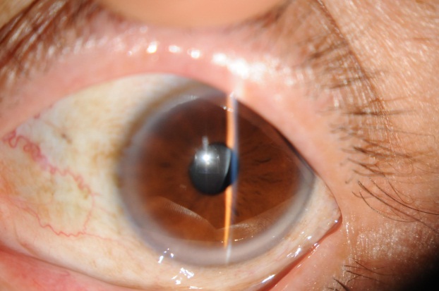 ??? 右眼術前,晶狀體脫位于前房???????? 左眼晶狀體同樣鼻側偏位明顯