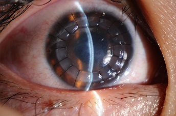 2013年12月底史偉云教授的特需門診迎來了一位來自云南省的特殊患者,患者小趙年僅15歲,一個月前查體時還顯示視力正常,幾天前晨起時突然發現右眼視力下降、黑眼球發白,當地多家醫院無法確診。并建議來我院就診,經史偉云教授的詳細檢查并根據多年來的豐富臨床經驗,診斷該患者右眼為“圓錐角膜急性水腫期”。患者右眼灰白色水腫,中央明顯前突,變薄(圖a),隨時有穿孔的風險,為保存患者眼球,史偉云教授先后兩次為小趙施行了角膜熱成形術(圖b)。待角膜水腫明顯消退后,為改善視力又為小趙施行了部分板層角膜移植術,術后小趙的愈合良好,視力恢復到0.2(圖c),一家人高興的帶藥出院,現已在校恢復正常學業。
