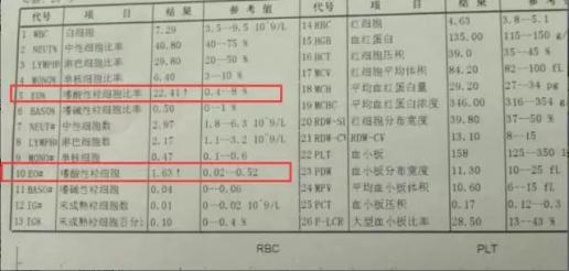 從上圖中可以看出,嗜酸性粒細胞比例、絕對值都升高了,常見癥狀可能是過敏或者寄生蟲病。
