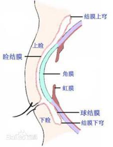 結膜(conjunctiva)為襯貼于眼瞼內面和眼球表面的一層柔軟、光滑、透明且富有彈性的薄膜,依據其所在位置可分為球結膜、穹窿結膜和瞼結膜。當閉眼時,形成密閉的結膜囊,保護眼球,并協助將淚液引流到淚道。