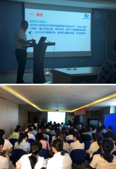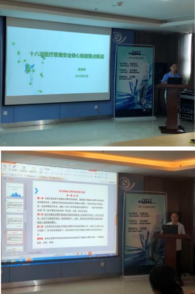 這次培訓考核分三個場次,全院共400余人次參加了培訓考核。6月20日,醫務部主任王富華為參訓人員深入解讀了18項醫療質量安全核心制度的要點;6月28日,醫務部副主任周英偉講解了《關于進一步加強患者安全管理工作的通知》、《醫療質量安全事件報告暫行規定》兩個文件的內容;7月4日,我院法律顧問張宗銀律師解讀了《執業醫師法》和《醫療機構從業人員行為規范》。院級培訓結束后,各醫療科室及護理單元組織開展了多種形式的科內學習,進一步增強學習的實效性。