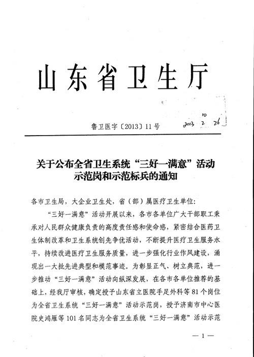 ??? 我院眼科專家史偉云教授,醫德高尚,服務意識強,具有良好的職業道德素養,參與活動積極主動,全心全意為人民服務,群眾威信極高,深得患者的信任和愛戴,受到社會各界的一致好評。被授予全省衛生系統“三好一滿意”活動示范標兵的榮譽稱號,成為全省101名衛生系統“三好一滿意”活動示范標兵之一。?