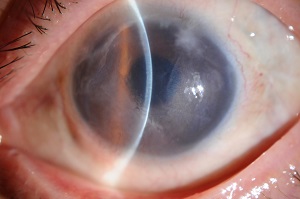 圖一: 角膜內皮細胞功能失代償患者,術前眼磨、眼痛,視力下降,術前視力0.02;