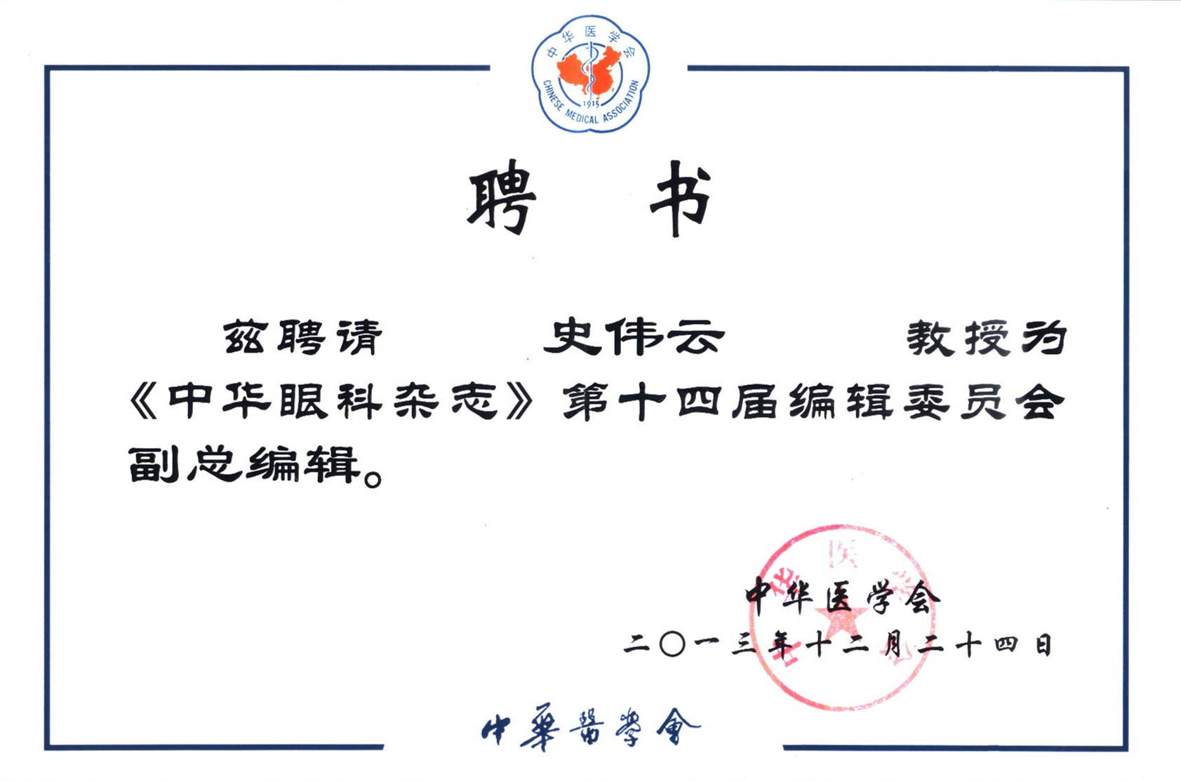 雜志編委會多年來一直遴選自全國百余位知名眼科專家,本次增選后設主編1人,副主編10人,委員若干。我院史偉云教授此次新增選為副總編輯是對史偉云教授的又一肯定。