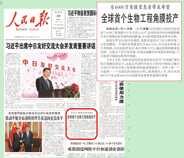 ?? ?以山東省眼科研究所、山東省眼科科醫院?謝立信院士和泰山攀登計劃特聘專家史偉云教授帶領的學術團隊參與了中國再生醫學國際公司研發的全球首個生物工程角膜,該生物角膜于2015年4月底獲得國家食品藥品監督管理總局頒發的醫療器械注冊證書,2015年5月23日正式投產上市。作為全球首個生物工程角膜,可廣泛應用于50%的角膜盲治療,將極大地緩解我國捐獻角膜奇缺的臨床困境,為我國400萬乃至全球6000萬的角膜盲患者帶來復明的希望。??