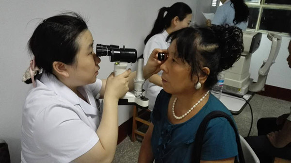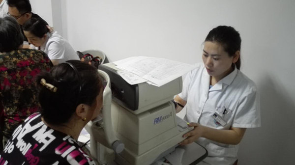 山東省眼科醫院孫曉蕾醫師為居民進行眼部檢查