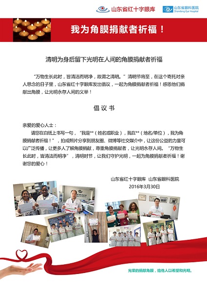 山東省紅十字眼庫聯合濟南市紅十字會、山東省眼科醫院發起的“清明為身后留下光明在人間的角膜捐獻者祈福”活動在世界范圍內引起了巨大的反響。本次活動微信瀏覽量達到數十萬次,國內外知名眼科專家及其團隊、國內外愛心人士紛紛拿起祈福紙板,將對角膜捐獻者的感激寫下,用自己的行動帶動身邊的人,一起參與到祈福活動中來,一起守護光明,讓光明永存人間,讓捐獻義舉被更多人認同。希望通過本次活動提高大家對角膜捐獻的關注力度,讓更多的人參與到祈福活動中來。