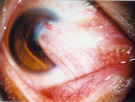 翼狀胬肉的臨床表現會隨著患者病情進展而不同。翼狀胬肉的分期為早期、中期和晚期。早期患者可能沒有任何感覺,只是在照鏡子時看見角膜周邊長入“肉肉”,由于患者主觀和客觀上并沒有感覺到很大的異常,對此類情況也不會很在意。等翼狀胬肉侵犯角膜時,病程進展到中期患者會有異物感,也就是俗話說的“磨得慌”,患者會覺得視物模糊、視物易疲勞等一些癥狀。晚期時(下圖2、3),當纖維結締組織侵入瞳孔時,就會自覺視力明顯下降,異物感明顯。患者此時會來醫院就診,延誤治療的最好時期。