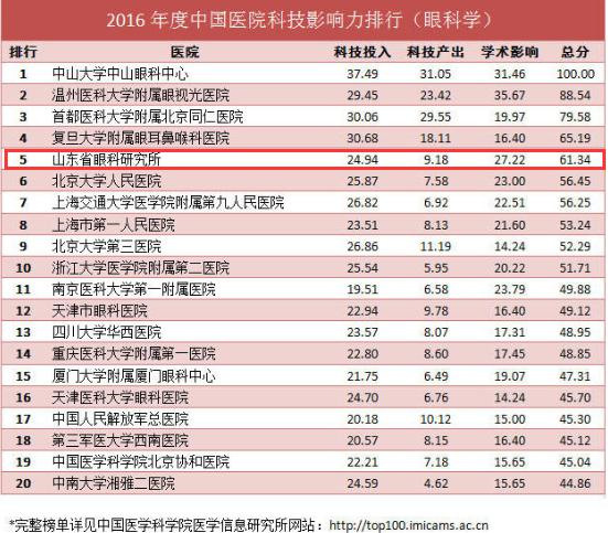 Chinese Hospital Technology Impact Rankings Year 2016 was released, Shandong Eye Institute (Shandong Eye Hospital, Qingdao Eye Hospital) rose to the fifth place in the rankings of national eye hospitals