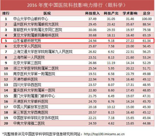 12月,2016年度中國醫院科技影響力排行榜,山東省眼科研究所(山東省眼科醫院、青島眼科醫院)躍居全國眼科第五名。山東省眼科研究所(山東省眼科醫院、青島眼科醫院)在本年度中國醫院科技影響力排行榜(眼科學)中位列第5位,連續三年蟬聯中國醫院科技影響力排行榜(眼科學)前十位。山東省眼科研究所(山東省眼科醫院、青島眼科醫院)在參評的眾多醫院中脫穎而出,充分證明了山東省眼科研究所(山東省眼科醫院、青島眼科醫院)的科技發展軟實力和以科技發展促進臨床發展的能力。?